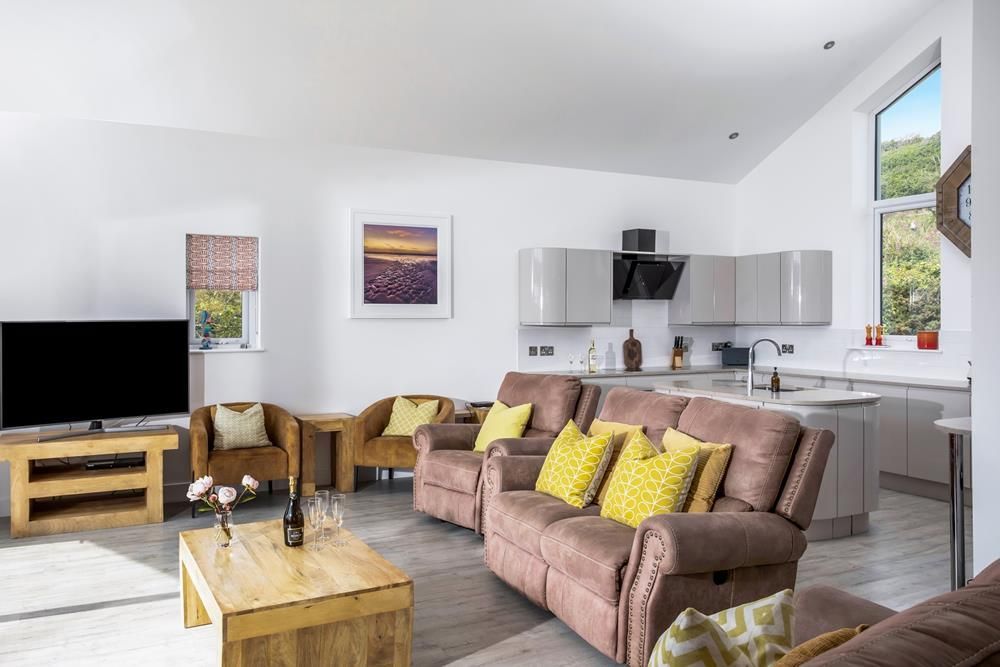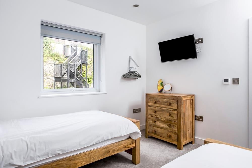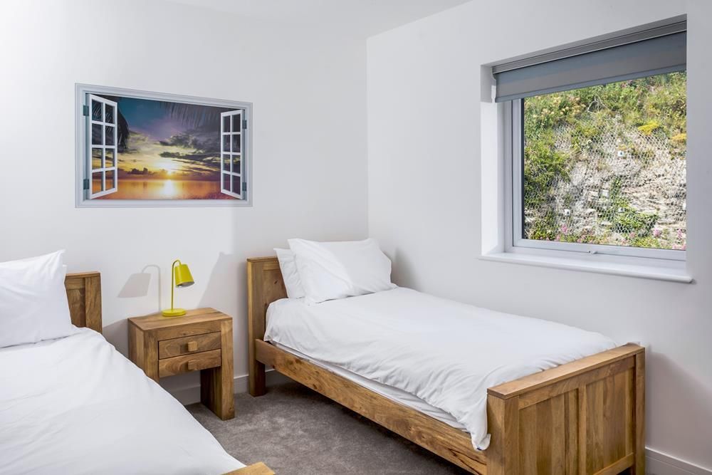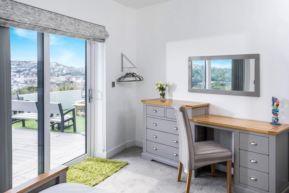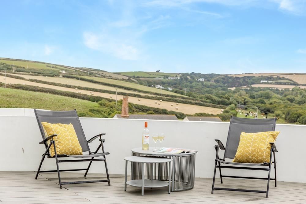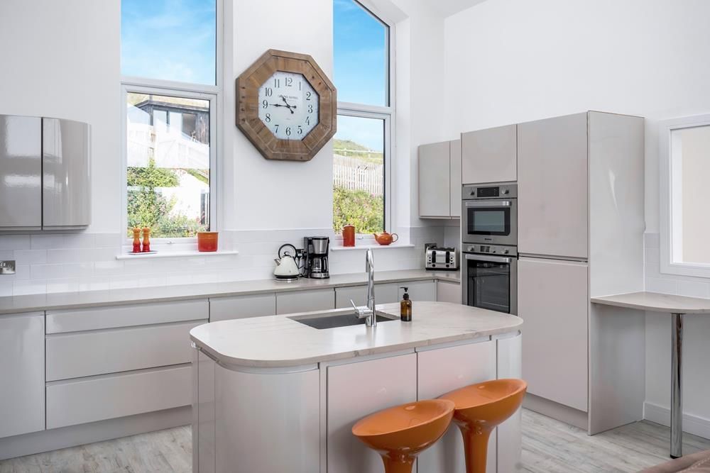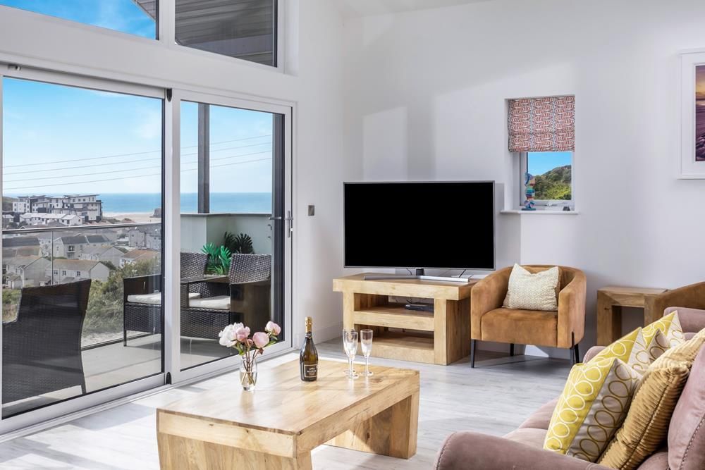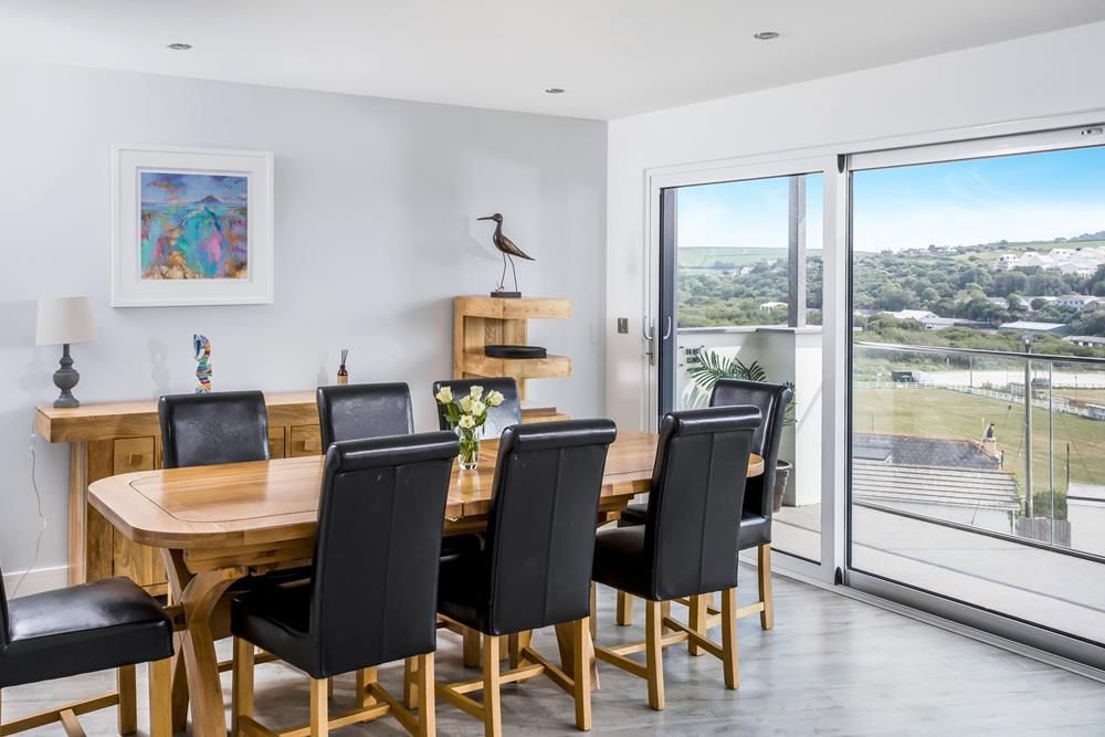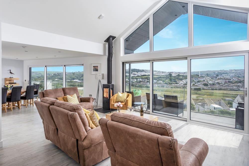This modern, reverse level home has an open plan living area with stunning views of the sea in one direction and country side in the other. It also has an incredible view of Perranporth as the home sits up on the dunes on Ramoth Way - perfect for watching the sunset over the ocean. Whilst it’s only a 10 minute walk from the front door to the dunes and beach, it feels tucked away and private to ensure you enjoy the perfect Cornish hideaway. You can open up the ceiling to floor doors in the summer and sit on the balcony or get cosy by the log burner during the winter months. Sleeping up to 8, it’s fantastic for two families and discounts are available for smaller occupancy.